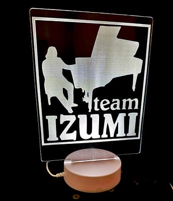 4月26日(土)ギャラリーがオープンしました。楽しみにされていた和泉ファンの皆様がたくさん来館されました。まずは皆様、和泉の愛飲したスペシャル・マンデリンコーヒー(愛用の豆を挽いてドリップするマシンの同機種で)をオーダーし、自筆の楽譜や懐かしの衣裳に見入られていらっしゃいました。所蔵CDをチェックしたり写真を撮ったりされました。後半では館長からの挨拶と諸々エピソード等の紹介があり、貴重映像鑑賞タイムでは、2016年9月3日の六本木キーストンクラブ「HIROMITSUレコ発ライヴ」の1stセットの模様が上映されました。館内はキーストンクラブと化し、そのライヴに実際に参加された方も数名いらして当時を偲ばれました。最後は和泉の好んだ紫色のダイアリーに記帳し、メッセージを残されました。この日来館されたましたH様より以下の特製アクリルライトスタンドが寄贈され、即館内に設置しました。どうもありがとうございました。